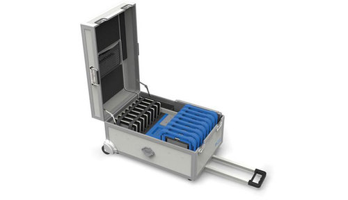 GoCabby Tablet-Aufbewahrungs- und Transportsystem für bis zu 16 Tablet-PCs bei vertikaler Lagerung, Ladung und Synchronisierung.